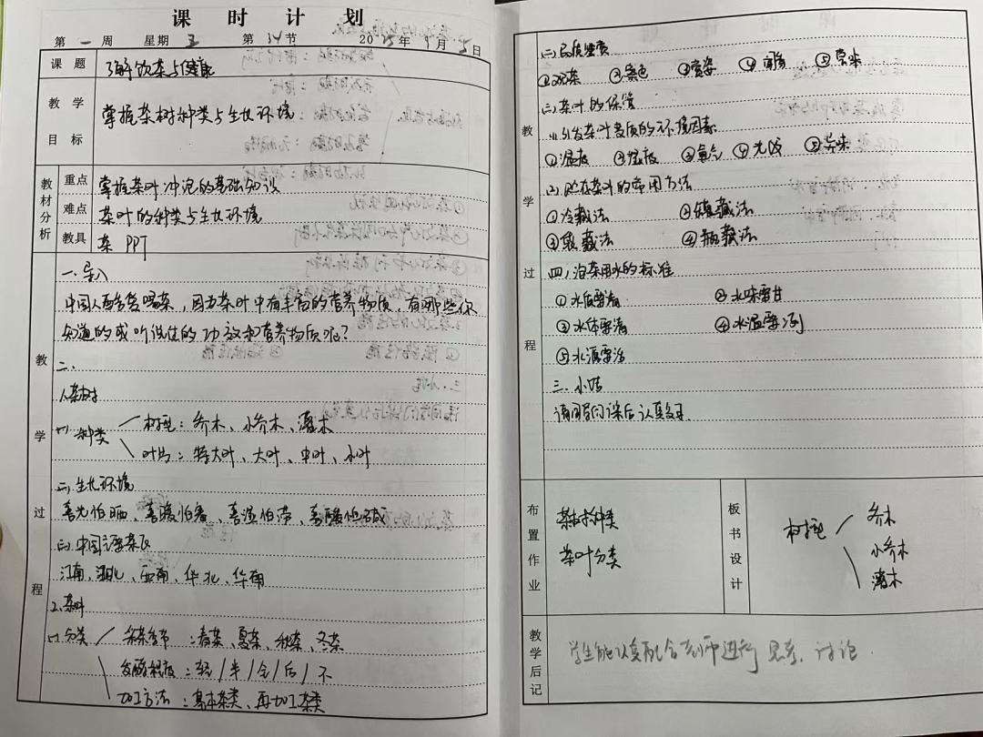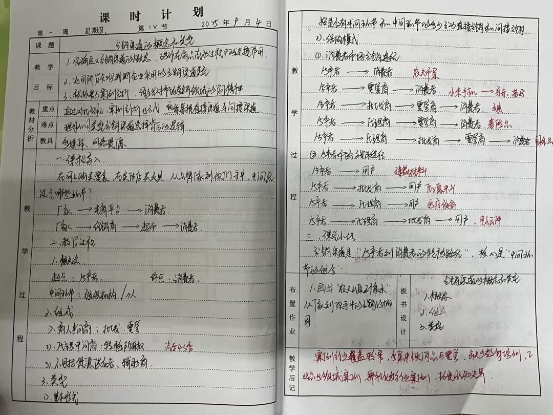例如鲍玺匀、苏皓、周梦瑶等教师,她们的教案不仅书写工整规范、认真细致,更在教学过程的呈现上运用不同颜色的笔对重点环节进行标注,使得教案重点突出、层次分明,为实际教学提供了清晰且实用的参考。